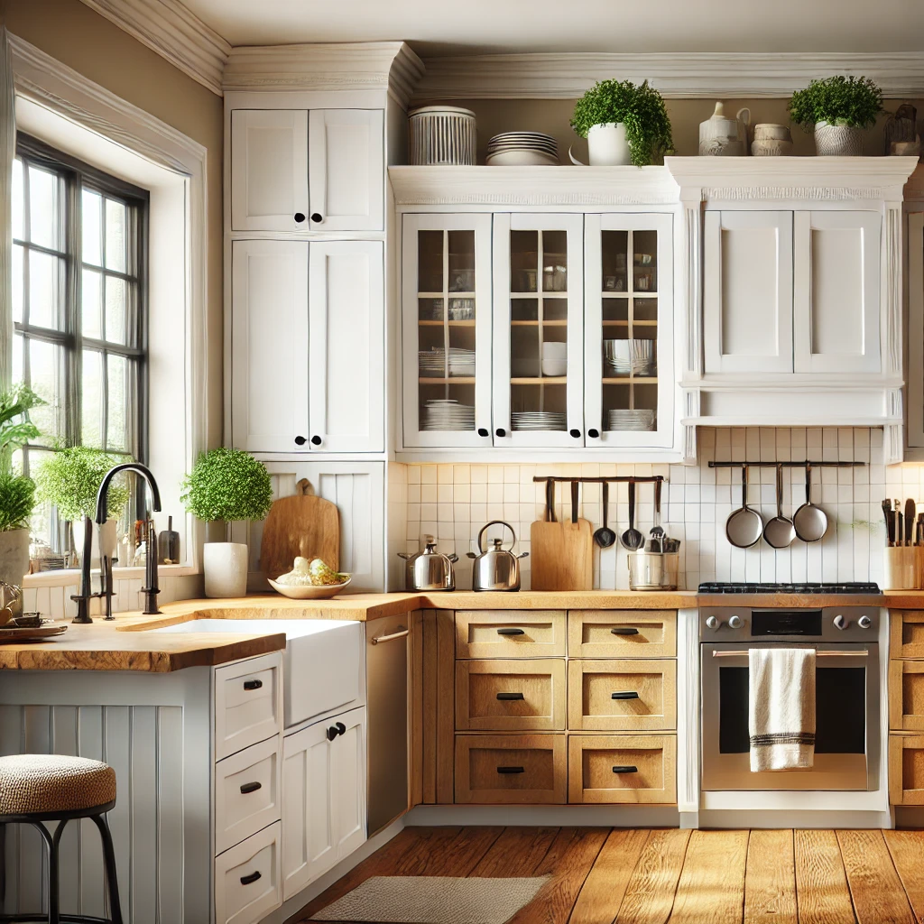 - Features: Shaker-style doors, natural wood finishes, and vintage hardware.